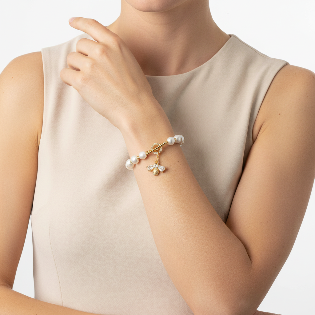 Smycke med naturliga sötvattenpärlor och dekorativ bi i guldplätering – stilfullt armband.