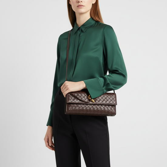 Tillverkad i quiltat svart läder och accentuerad med ett elegant guldspänne, utstrålar kuvertväskan lyx och stil. Det vävda mönstret och det matchande guldfärgade spännet förstärker dess unika design och gör den till en exklusiv och tidlös accessoar i din garderob.