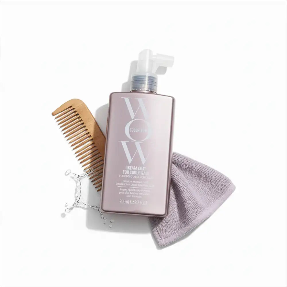 WOW Dream Coat för lockigt hår i grårosa flaska med kam och hårprodukter på vit bakgrund.