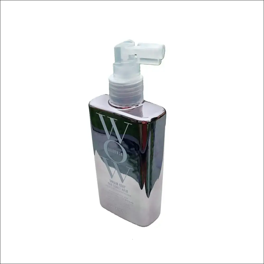 WOW Dream Coat for Curly Hair – anti-frizz spray i grårosa flaska med silkeslen finish för glansigt hår.